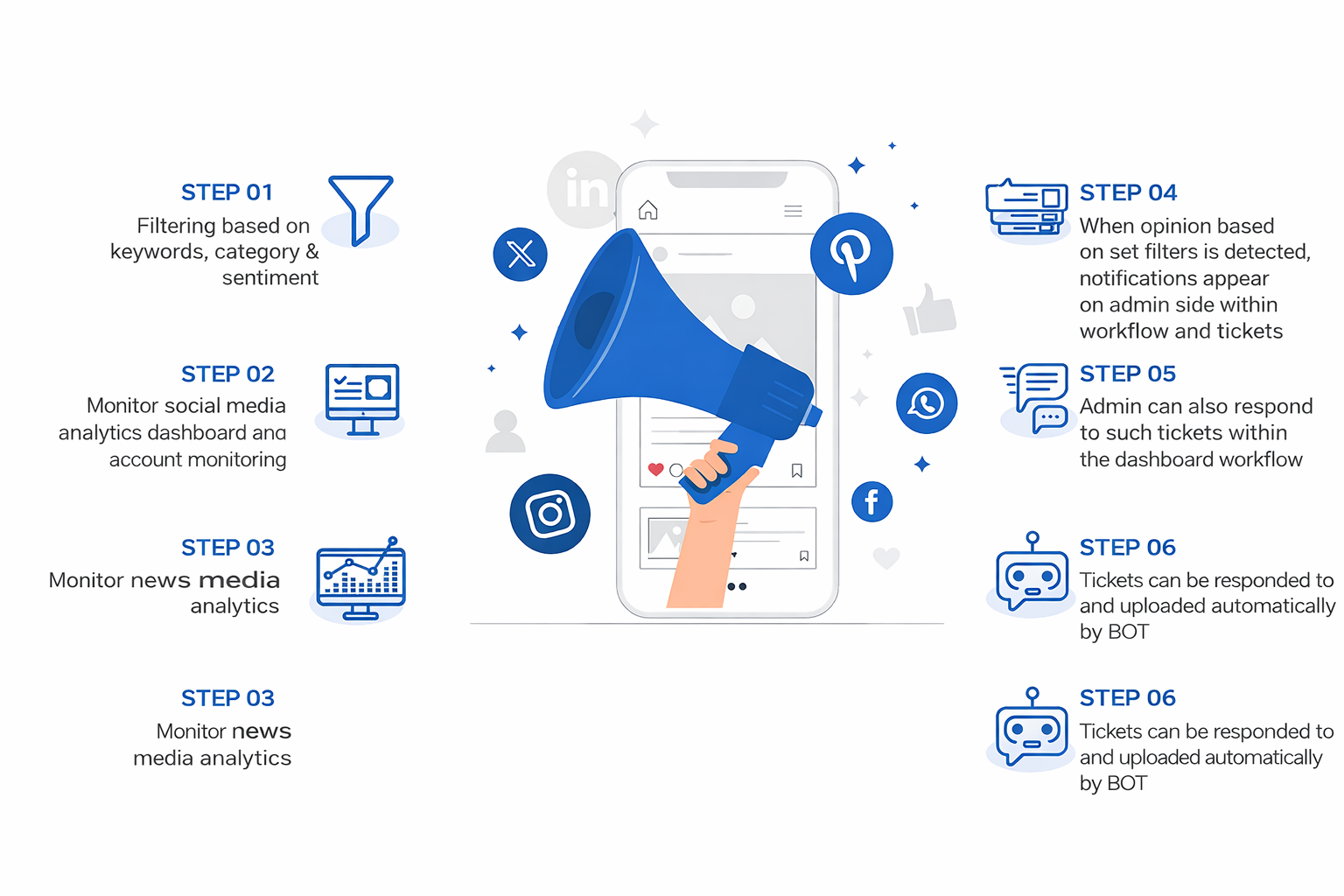 The ticketing system has a notification feature that is set up on the media & social media analytics dashboard system.
