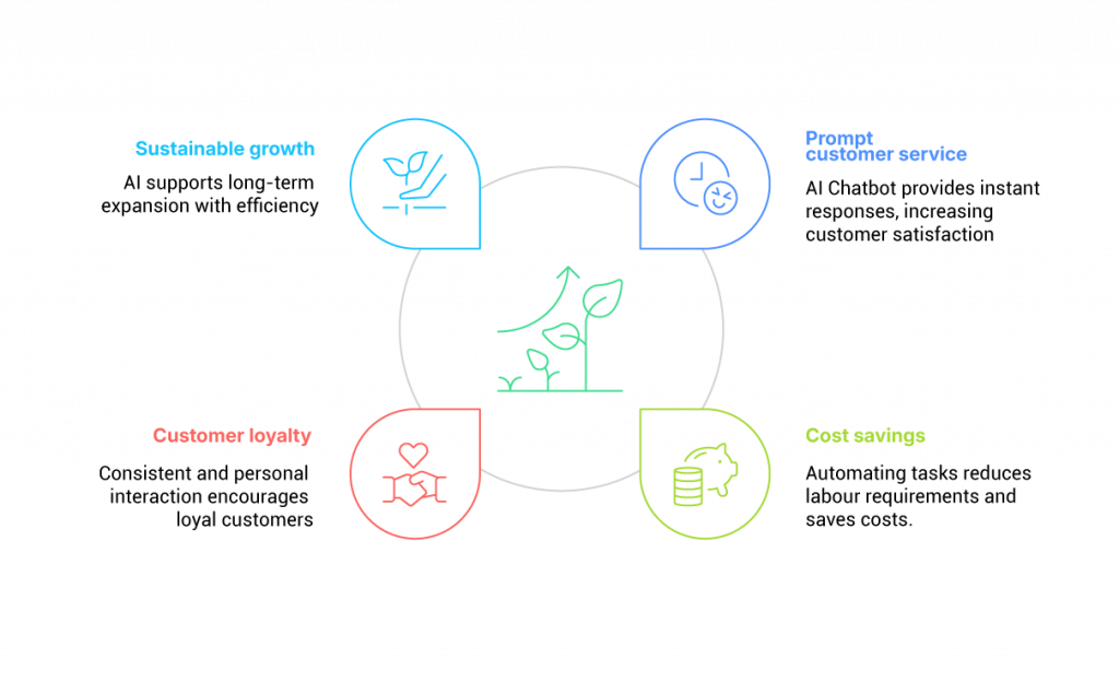 One study states that AI can increase the productivity of medium-sized businesses by up to 40% and reduce operational costs by 20-30%. With AI chatbots, business owners can focus on growth strategies, while chatbots handle technical and administrative matters.