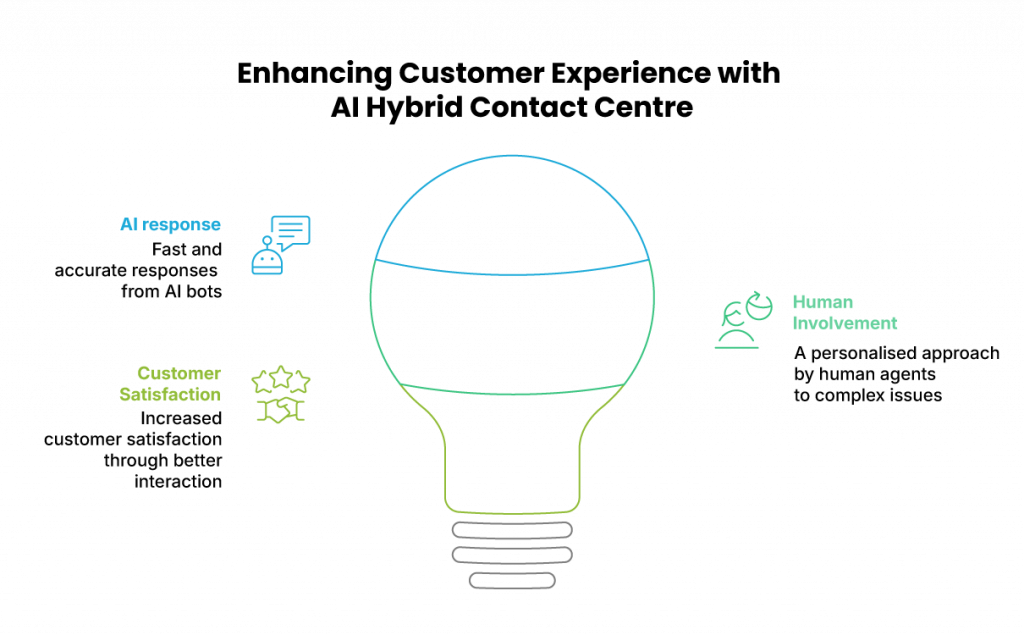 AI Hybrid Contact Centres can provide a better customer experience. With quick and accurate responses from AI bots, customers feel more satisfied. In addition, when more complex issues arise, human agents can provide more personalised attention, creating a better relationship between the company and its customers.