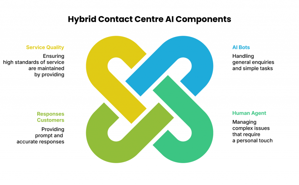 AI Hybrid Contact Centre is a system that integrates human agents and AI to handle customer interactions. In this model, AI bots can handle general enquiries and simple tasks, while human agents focus on more complex issues that require a personal touch. In this way, companies can ensure that customers receive fast and accurate responses, while maintaining a high quality of service.